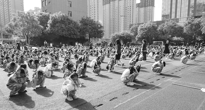 上午9时,随着警报声响起,演练正式启动。授课教师立即组织大家就地避险,学生们迅速蜷身躲入课桌下方,双手护头、紧贴桌腿,全程动作标准,反应敏捷。疏散指令下达后,全校师生按照“低楼层优先、分路线撤离”原则,在班主任和安全员的引导下快速、有序撤离。整个过程中未发生推挤、喧哗。仅用时3分28秒,全校师生均安全抵达了操场指定区域,展现出了扎实的安全教育成效。