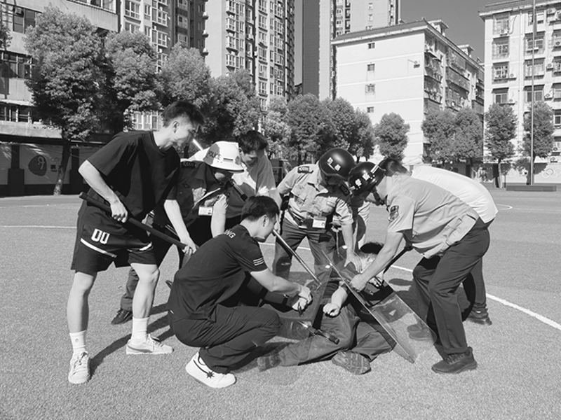 演练模拟持械歹徒翻越围墙强行闯入校园的场景。事件发生后,巡查保安第一时间持械与歹徒对峙周旋,学生迅速向老师报告,老师随即向值日领导汇报,接到报告后,学校立即启动反暴力应急预案。该校一方面迅速组织所有男教师投入救援,用钢叉、盾牌、警棍等防卫器材,与“歹徒”搏斗,很快将“歹徒”制伏;另一方面立即拨打报警电话,并通过校园广播通知各班启动紧急避险方案。班级内,老师向学生讲解防暴力相关知识,组织学生做好躲藏并堵好门窗,拿桌椅等挡住门口,防止暴恐分子进入,并寻找周围拖把、笤帚等物品,拿在手里,用以自卫,直到警报解除。