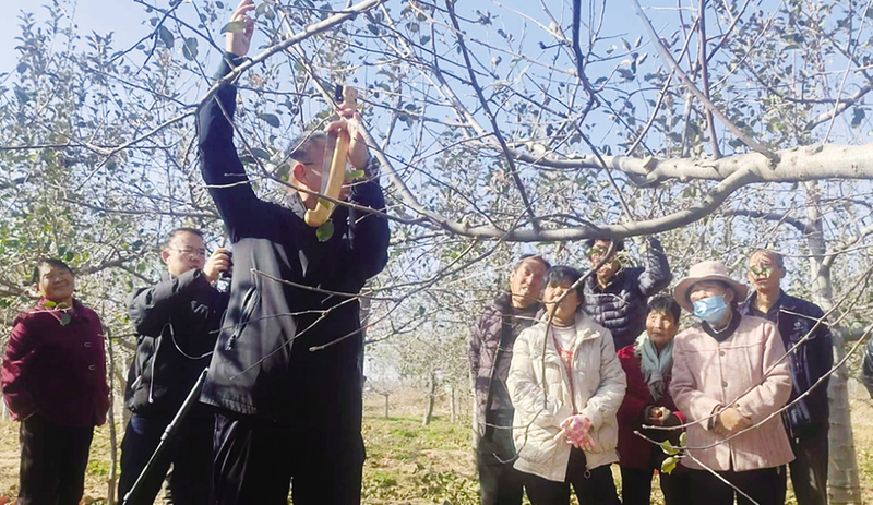 没有PPT,也不讲“天书”,王小军就站在果树下用枝剪当“教鞭”。“这密枝得剪掉,通风透光才是硬道理;病虫害别光靠药啊,‘草木灰+糖醋液’就能以柔克刚……”王小军边剪边说。他把树形修剪、水肥管理这些技术词变成了“大枝亮堂堂,小枝闹嚷嚷”的大白话,果农们则围着刚剪好的枝条抻着脖子瞅细节,并笑着说:“这课听得懂、用得上,心里踏实!”
