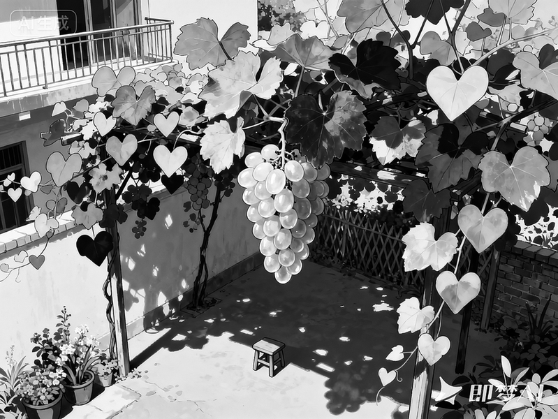 那个时候家里还没有装空调,炎热的夏天,晚上多半的时候,我们一家都是在葡萄架下度过的。婆婆喜欢在葡萄架下支张小桌,摆上零食、水果和自家的葡萄,然后看月光透过葡萄架,丝丝缕缕地泻到小院里来。蓝紫色的喇叭花躺在葡萄架上安安静静地睡熟了,它们的笑脸蜷缩着,露水沾湿了它们的梦。