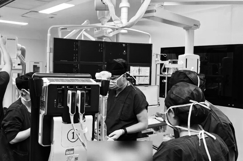 术中,各科室医生依次上阵:心胸外科一病区主任罗立峰紧急实施双侧胸腔闭式引流术,呼吸空间恢复了;介入血管科李荣华医生开展精准栓塞治疗,紧急完成脾动脉栓塞。在介入DSA影像下,医生清楚地找到了右主支气管动脉末梢的出血点,并立即实施栓塞。