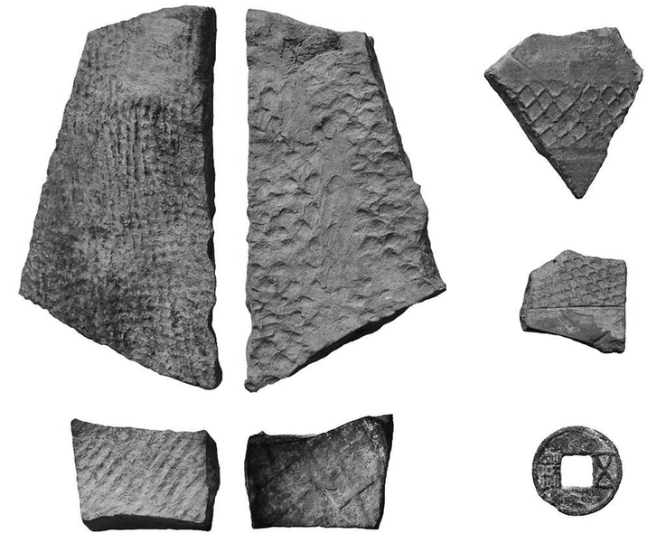 考古人员采集到的陶瓦片、五铢钱(资料照片)。(榆林市文物保护研究所供图)