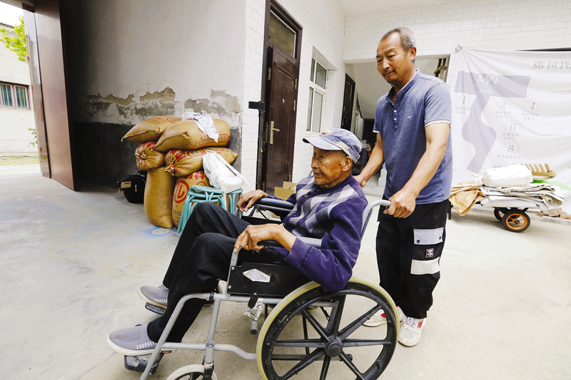 薛应财的儿子推着父亲在院子里散步。