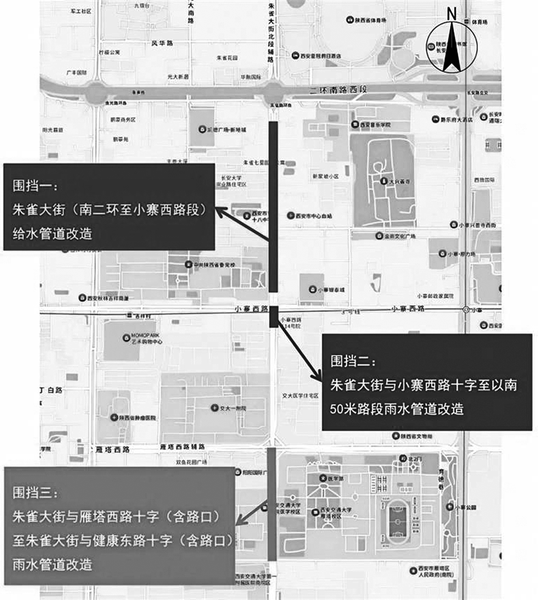 围挡三:朱雀大街与雁塔西路十字(含路口)至朱雀大街与健康东路十字(含路口)占用朱雀大街由南向北主路2条机动车道及由北向南主路1条机动车道,北向南方向调整为3条机动车道,南向北方向调整为2条机动车道。