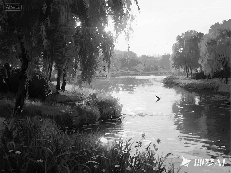 河水缓缓流动,清澈见底,河面在微风中泛起一层一层的涟漪,在阳光下闪着金光。一只不知名的银灰色水鸟展翅翱翔,从河面上欢快地掠过,斜着身子飞向远方……