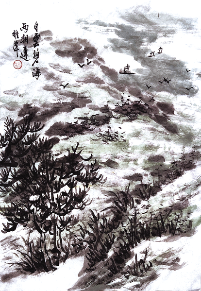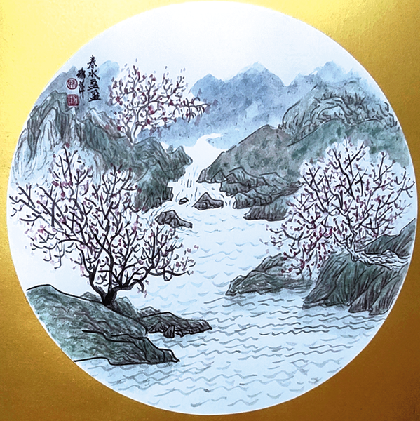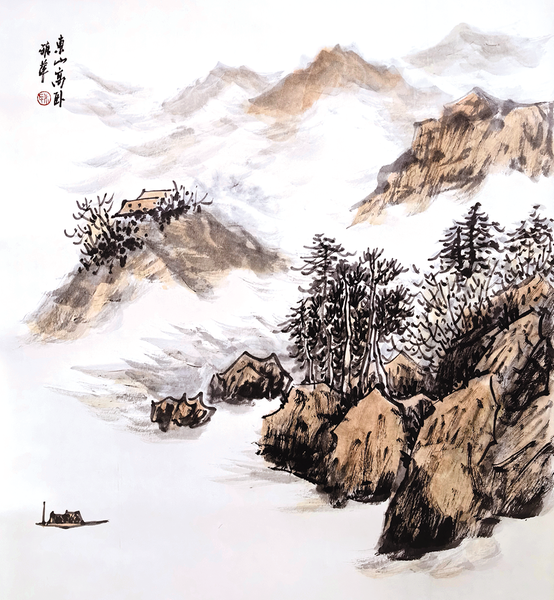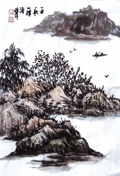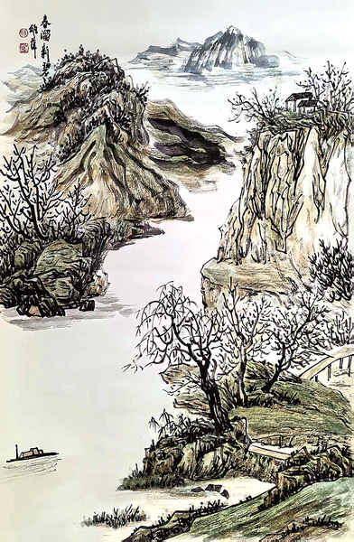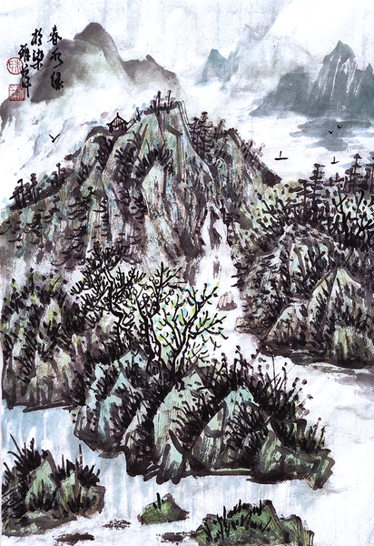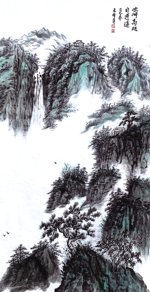 一道道山来,一道道水,朱雅萍老师的山水画千姿百态——在行万里路的基础上,她不断向名家学习,向古人学习,还读了万卷书。有了这两方面的积极与努力,她的画达到了大写意的地步。她画崇山峻岭,也画篱笆小院。巨幅画有巨幅画的思想和气势,小品画有小品画的韵味和情趣。华山的松树,秦岭的流云,泰山的石碣,黄山的花草,黄河的浪涛……有时晕染,有时勾勒,有时舒缓,有时细密;远远近近,浓浓淡淡,虚虚实实,光影点线,在她笔下交织自如,从容潇洒。她画王维笔下的“明月松间照,清泉石上流”;也画杨慎笔下的“滚滚长江东逝水”;还画陶渊明笔下的“采菊东篱下,悠然见南山”……