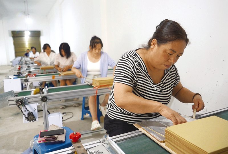 搬迁小区居民在社区工厂加工锡箔纸。