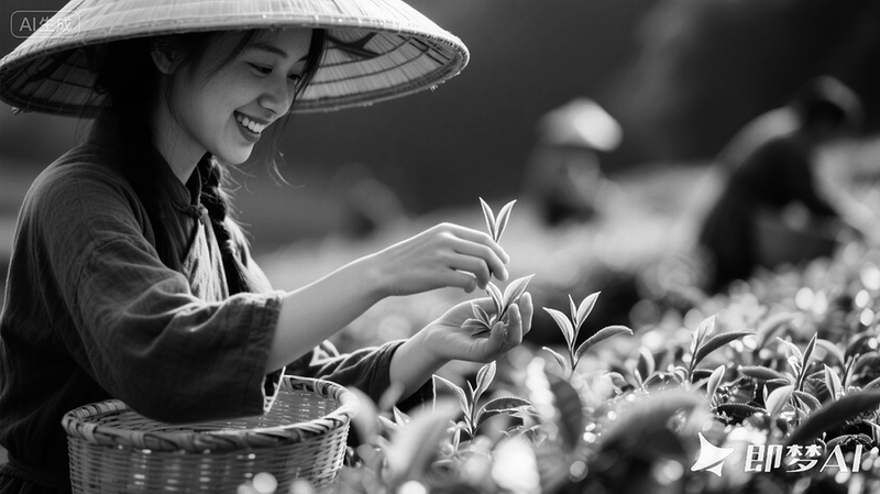 几位头戴斗笠、身着布衣、背挎竹篓的采茶姑娘灵巧地穿梭在茶陇间,一边愉快地歌唱,一边指尖翻飞,将一芽芽春色收入篓中。我饶有兴味地与其中一位笑起来真好看的姑娘攀谈。对方向我递过一撮新摘的茶芽,笑着说:“这是咱们安康山里特有的富硒茶,闻闻,多香!”我将细嫩的茶芽捧在掌心,嗅了又嗅,清幽的香气令人心旷神怡,不禁连声赞叹,继而品味和模仿着姑娘“要一捏一提,不能用指甲去掐”的采茶要领,一边帮助姑娘采茶,一边聆听她清脆悦耳的声音讲关于茶的故事。