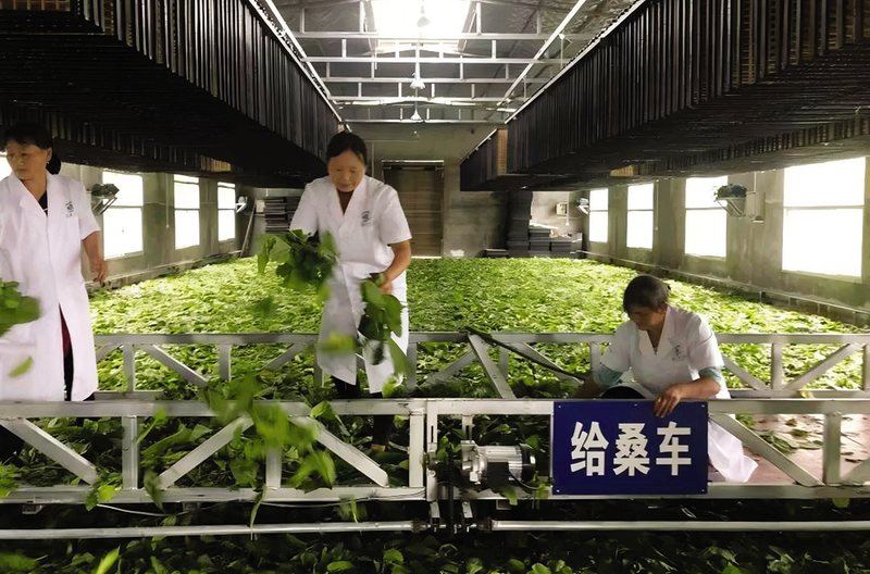 据了解,鑫辉沃丰公司自2021年成立以来,已在赤南镇长滩社区和袁家坝村建成桑园750亩、桑叶茶园50亩,流转224户农户的闲置土地800余亩,建成专业化小蚕共育室1处、自动化养蚕基地2处,总面积达2200平方米,并配套建设了桑叶红茶生产厂房等设施。目前,公司每批次可养蚕30至50张,年养蚕7至10批次。