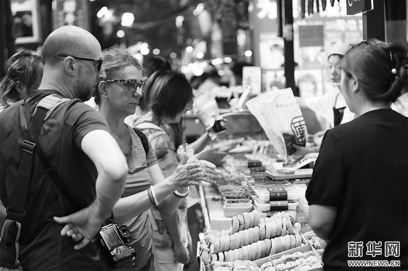 外国游客正在一个摊位前咨询西安美食。 新华网 王智超 摄