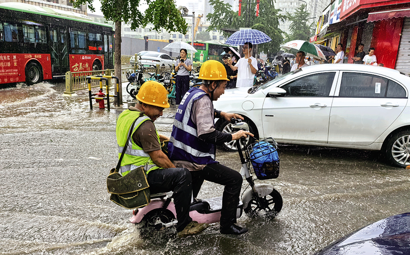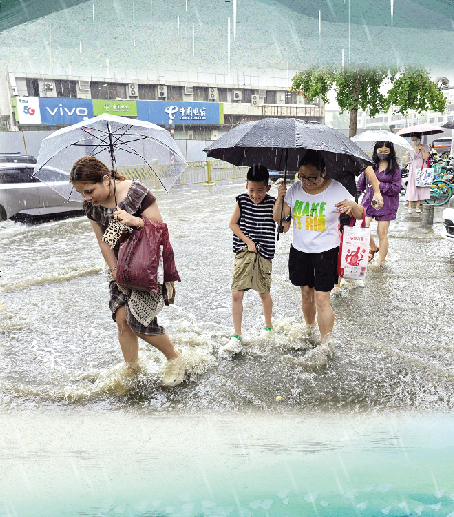 图1图2:9月18日,西安街头,市民冒雨出行。