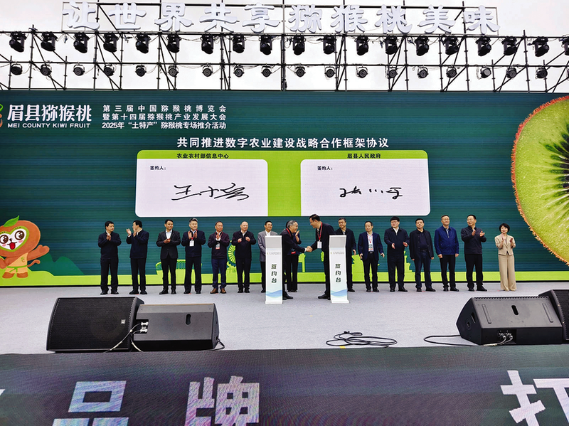 开幕式上,中国农产品市场协会会长、原农业部党组成员、国务院参事张玉香,中国果品流通协会会长鲁芳校分别讲话;宝鸡市人大常委会主任景耀平宣布大会开幕;眉县县委书记王继萍致辞;农业农村部信息中心主任王小兵与眉县人民政府县长张小平签订《共同推进数字农业建设战略合作框架协议》;陕西省农业农村厅副厅长贺军平为眉县颁授“省级农产品加工园区”牌匾;陕西省市场监督管理局二级巡视员马生学发布陕西省《猕猴桃生产标准综合体》地方标准;首衡集团副总裁杨建飞,哈萨克斯坦东干协会主席、新丝绸之路公司董事长、哈萨克斯坦陕西村村长安胡塞作主题发言;会上发布了《2025年中国·眉县猕猴桃指数》,为全国首张“猕猴桃主题借记卡”揭牌。