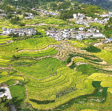 金秋时节,汉阴县凤堰梯田景区,层层叠叠的梯田上,稻穗低垂、金黄遍野,描绘出一幅忙碌而喜悦的丰收画卷。