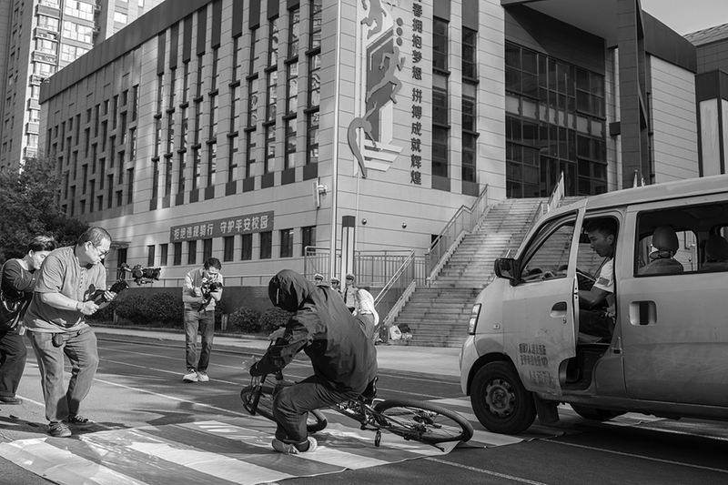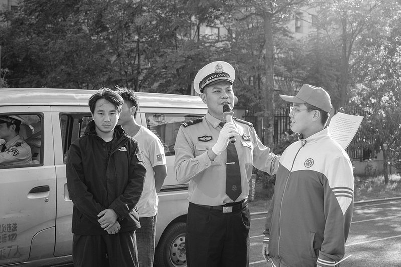 活动开场,学生们在操场整齐列队,摆出“交通安全”4个醒目大字,随后学生带来武术《龙拳》的表演。学生们精神饱满,展现了青春风采,赢得全场掌声。紧接着,交管莲湖大队宣讲民警开启主题宣讲。首先,6名莲湖大队铁骑队员驾驶摩托车登场,连贯完成站立敬礼、隐蔽驾驶、绕桩、警卫队形变换等特技表演,精湛的驾驶技艺让学生直观感受到规范驾驶的重要性。随后,专业特技演员还原6类常见交通事故场景——“鬼探头”、行人闯红灯、不走人行道、骑自行车看手机、逆行、“开门杀”,逼真的场景让学生深刻认识到违规出行的危害性。