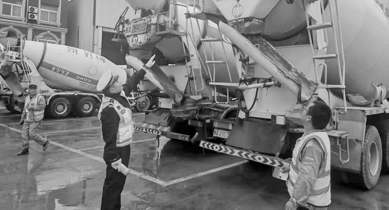 在检查环节,民警深入企业停车场,对停放在场内的混凝土搅拌车、罐式运输车等重点车辆进行了“过筛式”检查,详细查看了车辆的制动系统、轮胎磨损状况、灯光信号装置以及反光标识、防护装置的完整性和规范性;对检查中发现的安全隐患,现场向企业负责人进行了反馈,并下达整改通知,要求其限期整改到位,形成闭环管理。安全宣传教育同步进行。