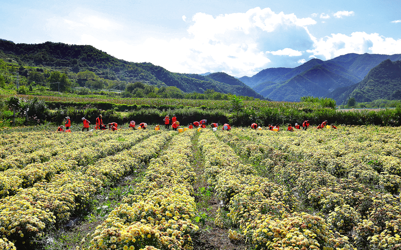 近年来,上寨子村党支部围绕中药材产业,大力推进“强药”战略,通过“村党支部+合作社+农户”的发展模式,充分利用闲置撂荒的坡地,大力推进黄芪、菊花等中药材规模化种植。如今,这里的100多亩菊花已进入采收期,除了经济效益可观,还为人们就近赏花休闲增添了一处新选择。