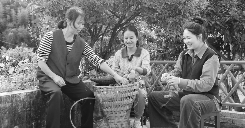 莫朗颂(中)和弟媳陪婆婆摘菜。
