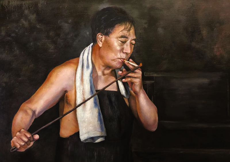▲作家白描打铁歇息时,点一支香烟解乏。