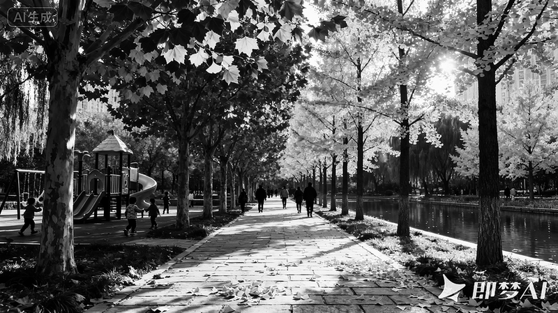 长安中央公园是市民休闲的狭长步道,林荫夹道,绿水环绕,还有一些儿童游乐设施,是大人散步、儿童玩耍的好去处。入园时,风正裹着细碎的凉意拂过面颊,片片黄叶随风飘落,哦,今日是寒露了。尽管长安的秋不疾不徐,秋意终是漫进了这座城市的肌理。往日里浓得化不开的绿意,如今已被秋霜染出了层次。道旁的法国梧桐,叶片边缘先褪成了浅黄,再往叶心去,仍是深绿。不远处的银杏,已然迫不及待地换上了金装,阳光透过枝叶洒下来,叶片便泛着细碎的金光,风一吹,便有几片打着旋儿落下,铺在青石板路上,像极了散落的碎金。
