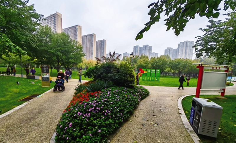 晨练老人轻放的脚步、孩童绕开的身影,都是与过往的温柔对话,唯有偶尔掠过的风,带着古意轻诉过往。公园内有1.1公里长的环形健身步道,配有48处健身器材,以满足不同人群的健身需求。四周活动场地随着晨昏四季,酿出不同热闹与诗意。